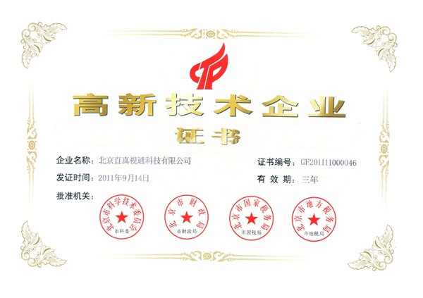 经过北京市政委、市政局、市国税局、市地税局组织专家进行评审,北京真视通科技股份有限公司于2008年12月18日获得首批由科技部、国家税务总局联合颁发的国家级高新技术企业证书。