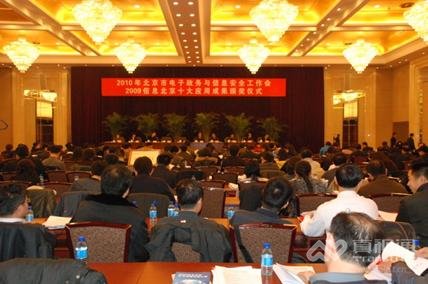 2010年全市电子政务和信息安全工作会、信息北京十大应用成果评选活动今日在北京会议中心共同举办,市经信委主任朱炎同志主持,市委、市科技委等领导均到场出席。此次评选活动以“两化融合促首都经济发展”为主题,共收集成果近百项,通过网络投票、专家评审、答辩等形式评选出优秀成果在大会表彰授版,全方位地展示了首都在“十一五”期间取得的信息化建设成果。