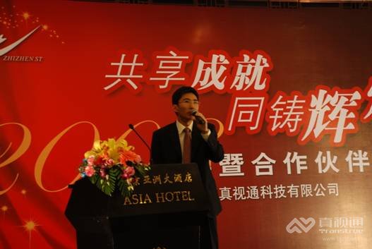 共享成就 同铸辉煌----2008真视通亿元庆典暨合作伙伴答谢会隆重举行 2008年5月16日,北京真视通科技股份有限公司在亚洲大酒店举行主题为“共享成就同铸辉煌----2008真视通亿元庆典暨合作伙伴答谢会”与合作伙伴共聚一堂,共享真视通成就,畅想更加美好的明天。 活动气氛不知不觉被“5·12汶川事件”所感染,合作伙伴纷纷奉献爱心,共募集爱心捐款逾万元,真视通公司将会把这份爱心转达给在地震中受苦受难的同胞们! 公司总经理王国红先生致答谢辞 答谢会现场