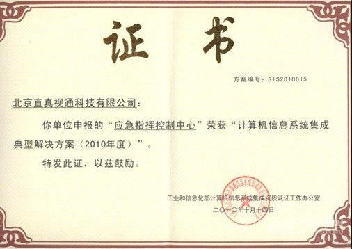 行业内各大系统商涌跃参与典型解决方案参加活动评选,北京真视通科技有限公司公司申报的应急指挥控制中心获“2010年度计算机信息系统集成典型解决方案”。