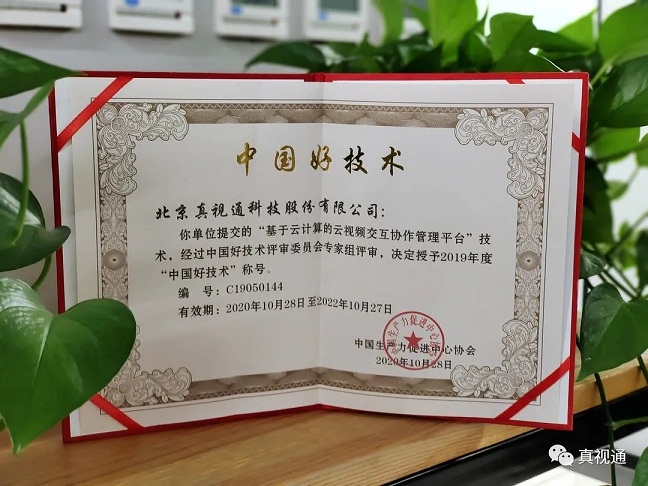 论坛上对获得2019年度“中国好技术”称号的项目进行了授予。真视通的“基于云计算的云视频交互协作管理平台”,经过评审委员会专家组评审,获得“中国好技术”称号。