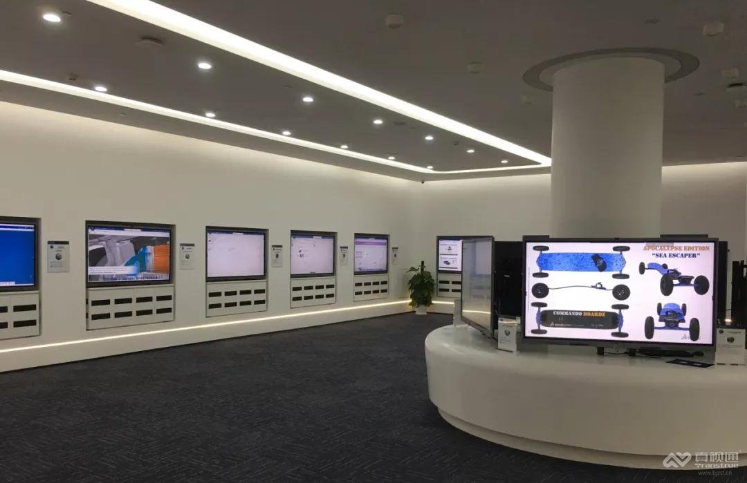 整个展厅通过各种显示设备,实现达索软件对:航空航天行业、交通运输行业、汽车产业、工业设备行业、钢铁行业、生物制药行业等内容进行展示。