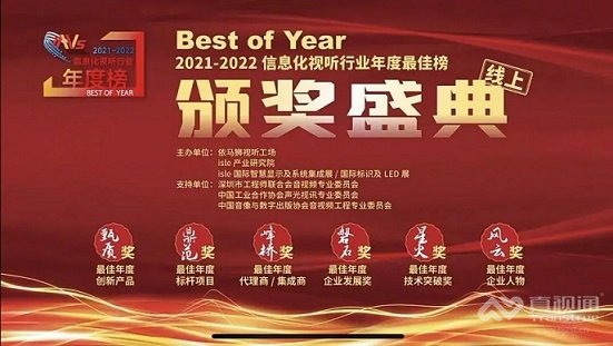 近日,“Best of Year 2021-2022信息化视听行业年度最佳榜单”颁奖盛典在线上隆重举行。本届颁奖盛典由依马狮视听工厂、isle产业研究院、isle展联合主办,以及多家行业委员会联合支持。本年度最佳榜单,以褒扬先进、助力企业和行业发展为宗旨,携手专家、同仁聚集行业智慧,深研行业发展现状,擎见发展新格局,共同探索行业新未来。