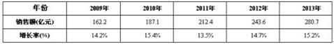 表7 2009-2013年中国机房产品市场市场销售额预测