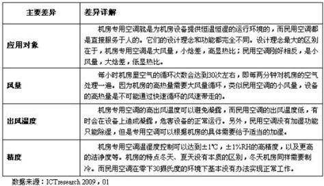 机房精密空调系统的任务是为保证机房设备能够连续、稳定、可靠地运行,需要排出机房内设备及其它热源所散发的热量,维持机房内恒温恒湿状态,并控制机房的空气含尘量。为此要求机房精密空调系统具有送风、回风、加热、加湿、冷却、减湿和空气净化的能力。机房空调广泛应用在电信交换机房,银行中心机房,移动基站,实验室,博物馆,档案馆等对环境要求较高的场合。随着中国对机房整体认识水平的加深,机房空调的使用在机房呈现逐年增加的势头。