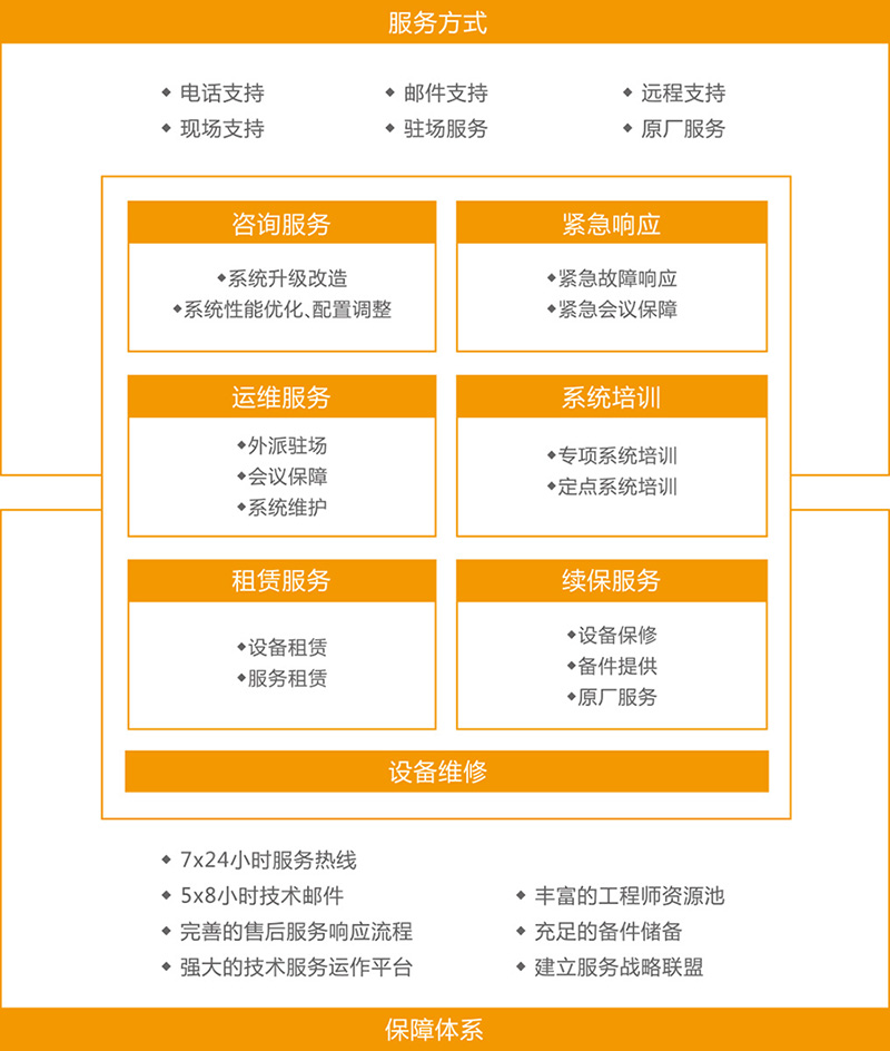售后服务事业部为公司的专职服务部门,部门组织架构依据ITSM服务模式进行搭建,负责公司所有业务的售后服务工作,【有专业的服务管理平台,可对客户档案及服务工作进行管理,】7X24小时电话支持,可提供专业的外包服务工作,包括会议保障、系统维保、外派服务、故障处理等以及远程诊断服务等,同时公司在全国设立分支机构及服务网点,为客户提供及时周到的服务。